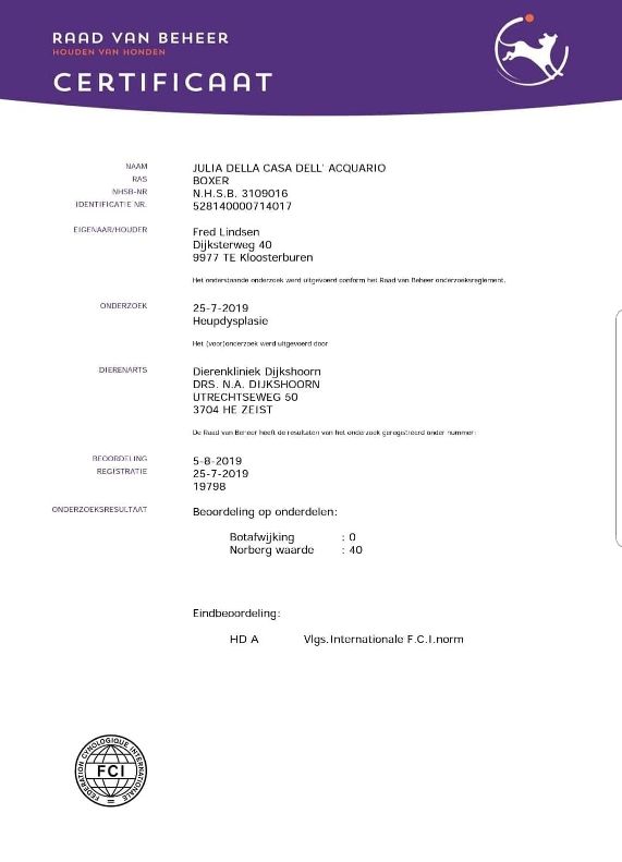 HD- Ergebnis von "Julia Della Casa Dell'Aquario" in Holland, sie hat HD: A erhalen :-) Wir freuen uns sehr mit Ria & Fred und gratulieren vom Herzen!!! Somit ist sie Herz und HD frei!!!
